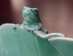 大きな蓮の葉の端に掴まっているカエルさん。器が大きいとカエルさんが小さく、より可愛らしくみえますね。